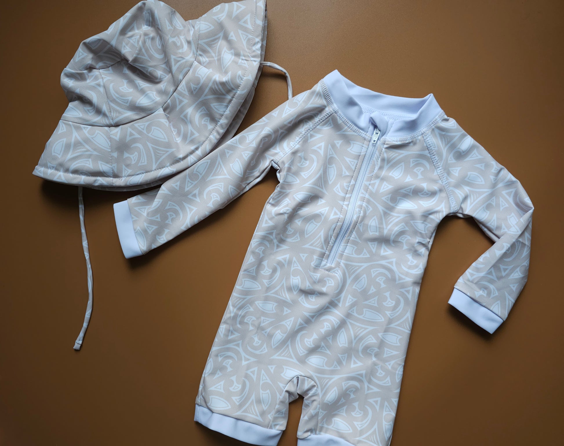 One-piece swimwear set, long-sleeved swimsuit is designed for babies and kids, providing maximum sun protection with UPF 50+. Matching pōtae Included.